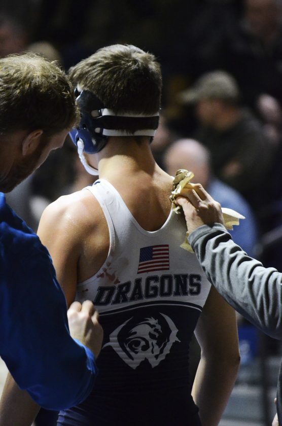 - Warren coaches wipe down John Fankhouser during an injury timeout in his 152-pound match against Titusville’s Jesse Titus at Warren Area High School, Monday, Jan. 21, 2019. Titus began bleeding from the nose during the match and action had to be stopped to get both grapplers cleaned up.