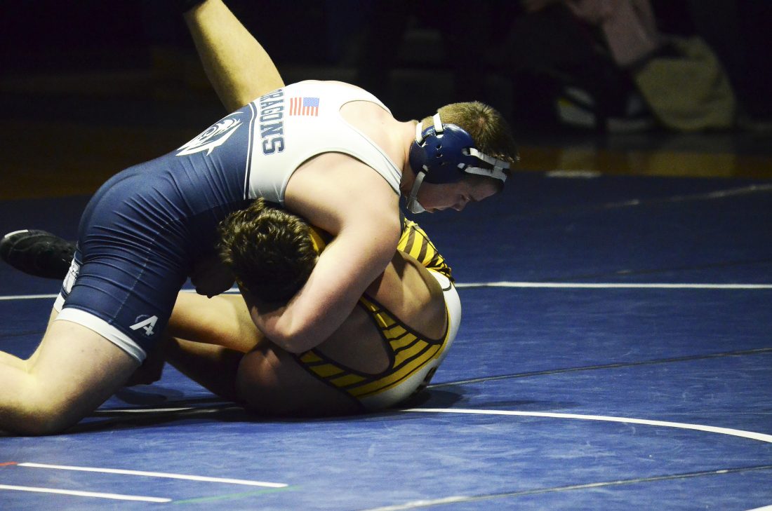- Warren’s Joey Arnold tries to turn Titusville’s Joe Jacobson during their 220-pound match at Warren Area High School, Monday, Jan. 21, 2019. Arnold won a 13-5 major decision, but the Rockets defeated the Dragons, 43-34.