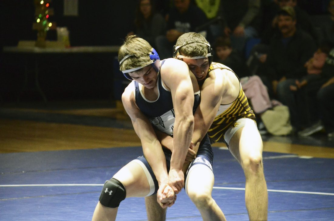 Warren’s Zack Zinger tries to escape the grasp of Titusville’s Levi Nosko during their 170-pound match in the Joseph A. Massa Memorial Gymnasium, Monday, Jan. 21, 2019. Nosko picked up a third period pin to help lead the Rockets to a 43-34 win over the Dragons.