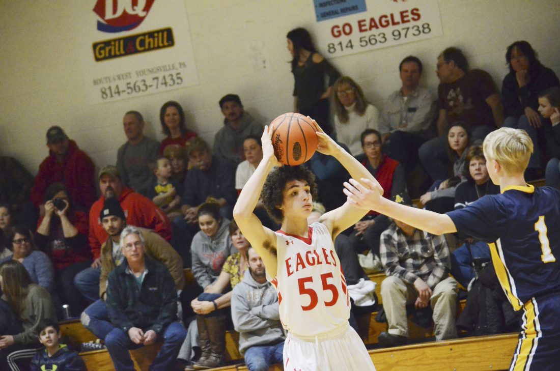 - Youngsville’s Joe Mack drives to the basket as Caleb Robinault (2) tries to block his shot during the first quarter of Friday’s game. Jared Martone (21) took the charge on the play for Eisenhower, but it was the Eagles who came away with a 50-26 victory.