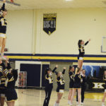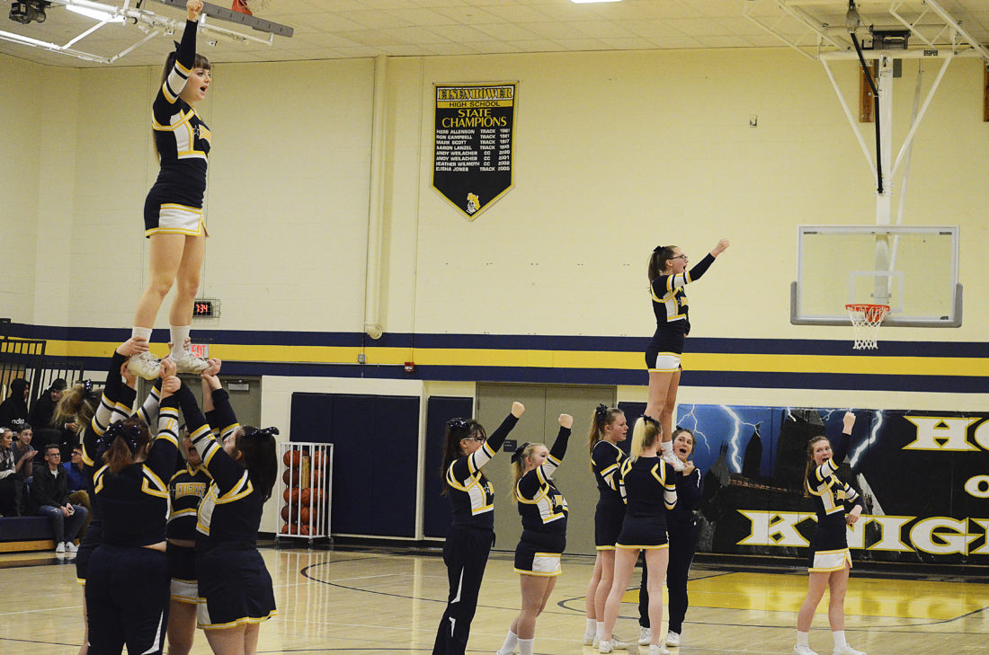 - Eisenhower cheerleaders fire up the crowd during halfttime of a game between the Knights and Maplewood at Eisenhower High School, Wednesday, Jan. 9, 2019.