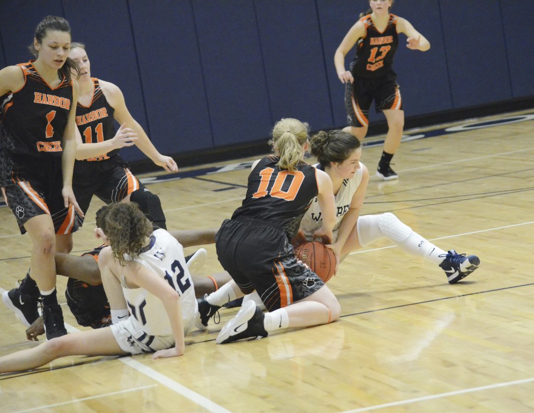 Warren’s Alanna Hultberg fights for a loose ball with Harbor Creek’s Ali Benim during the fourth quarter. Hultberg made a number of big plays down the stretch in the Warren win.