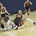 - Warren’s Alanna Hultberg fights for a loose ball with Harbor Creek’s Ali Benim during the fourth quarter. Hultberg made a number of big plays down the stretch in the Warren win.