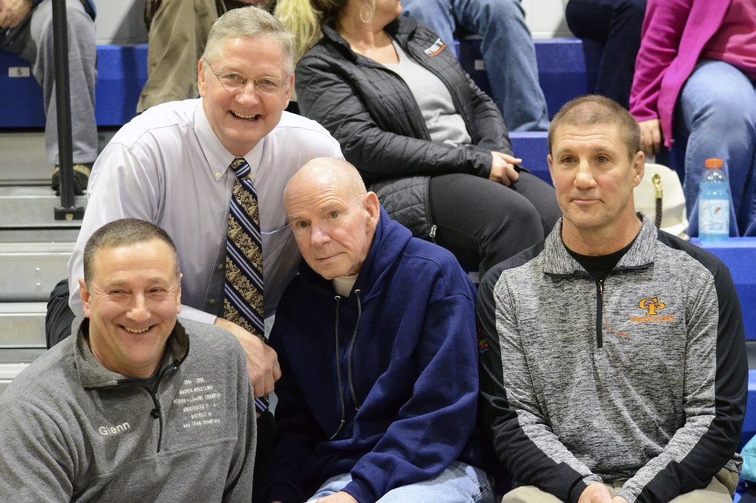 The Warren wrestling team honored it’s former, and current, coaches as part of their 70th anniversary celebration during a pre-match ceremony in the Joseph A. Massa Memorial Gymnasium, Thursday, Jan. 24, 2019. Former coaches Lee Chew (1969-1982, 79-79-5), center, Mike Hahsey (1988-1993, 49-22-1; current head coah at Erie Cathedral Prep), right and Glenn Baldensperger (2001-2015, 141-104) sit with current coach Dean Johnson (2016-present, 22-25) following introductions.