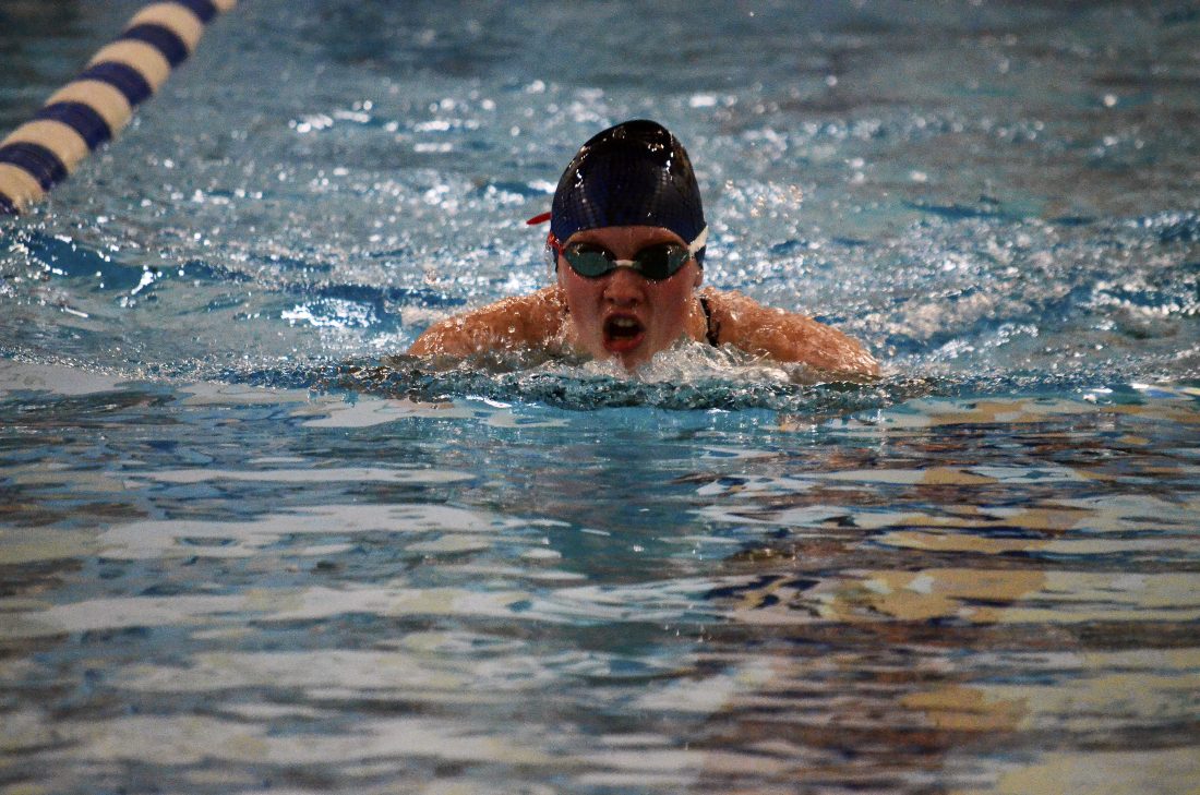- Warren’s Sophie Olson comes up while swimming the breaststroke leg of the 200 IM during a meet with Mercyhurst Prep at the Warren County YMCA, Thursday, Jan. 17, 2019. Olson took third in the event and the Dragons held on for a dramatic, 85-84 win over the Lakers.