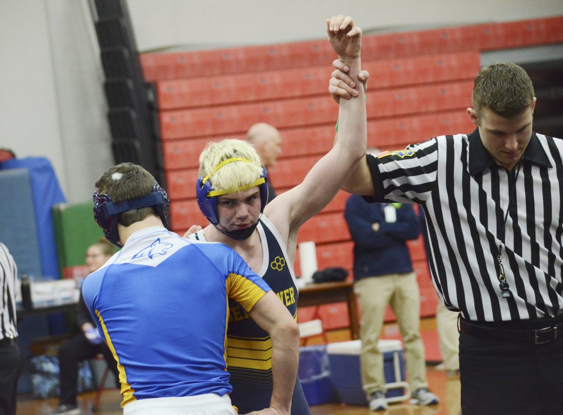 Eisenhower’s Gannon Jaquay gets his hand raised by the official after pinning Seneca’s David Hall in their 7th place match on Saturday at Meadville. Jaquay needed the win to move on to districts, and he got it.