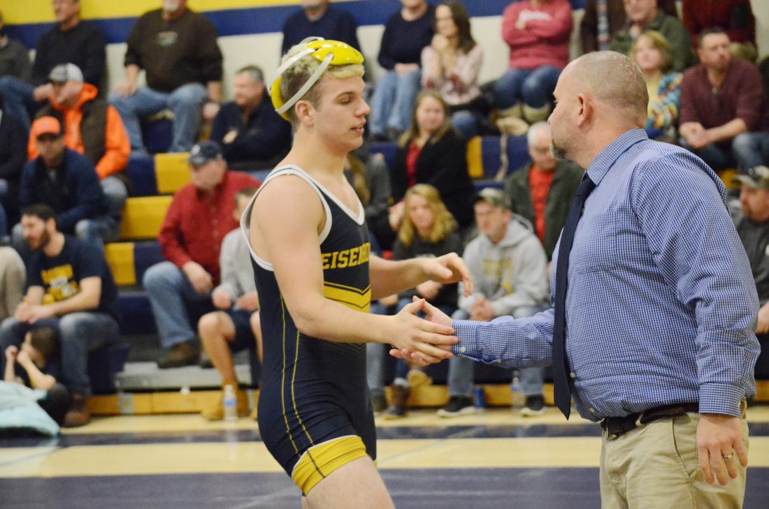 Eisenhower’s Ethan Chambers shakes hands with head coach Kris Black following his pin over Harbor Creek’s Jaden O’Hara in their 182-pound match.