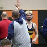 Eisenhower’s Logan Jaquay shares a high-five with coach Kris Black following Jaquay’s quarterfinal match win in the District 10 Class 2A Tournament at Sharon High School, Friday, Feb. 22, 2019. With the win, Jaquay not only advanced to the semifinals of the tournament, but secured a berth in the regional tournament as well.