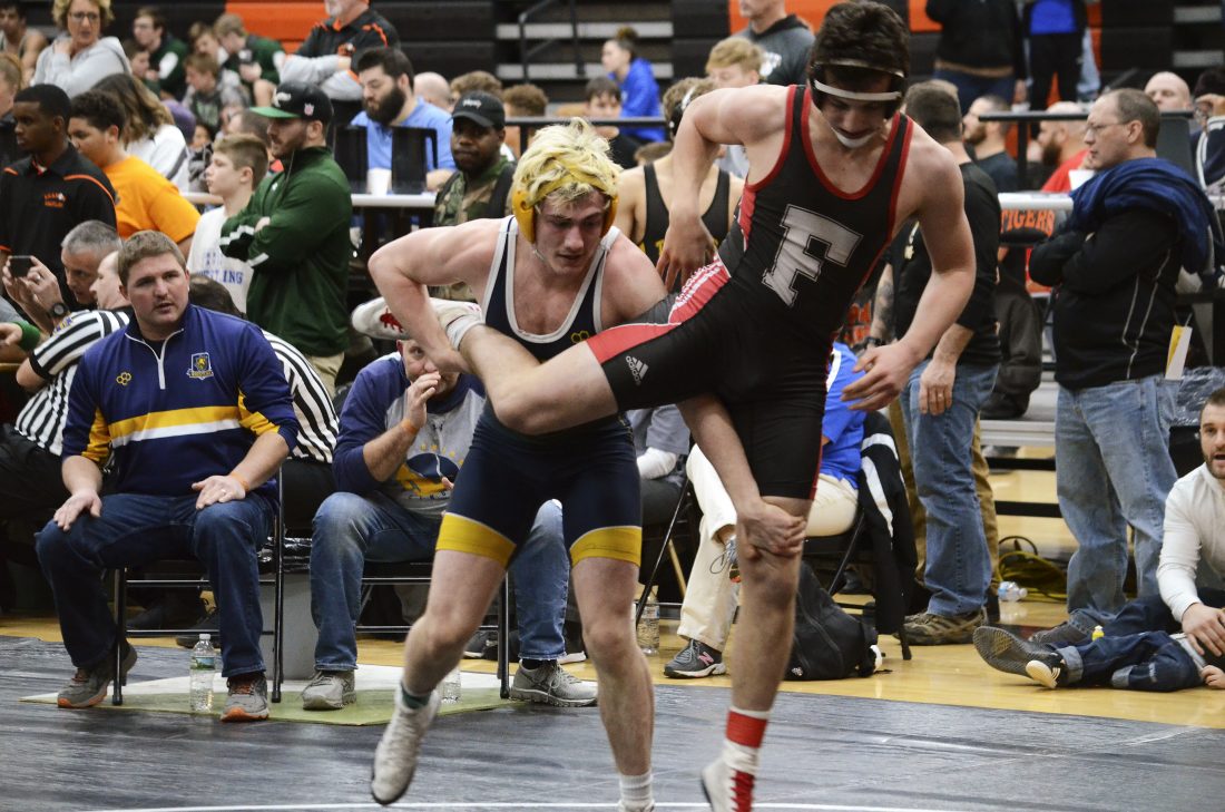 Eisenhower’s Alex Barnett grabs Franklin’s Carson Wible in a single leg during their 160-pound preliminary match at the District 10 Class 2A Tournament at Sharon High School, Friday, Feb. 22, 2019. Barnett pinned Wible to advance to the quarterfinals.