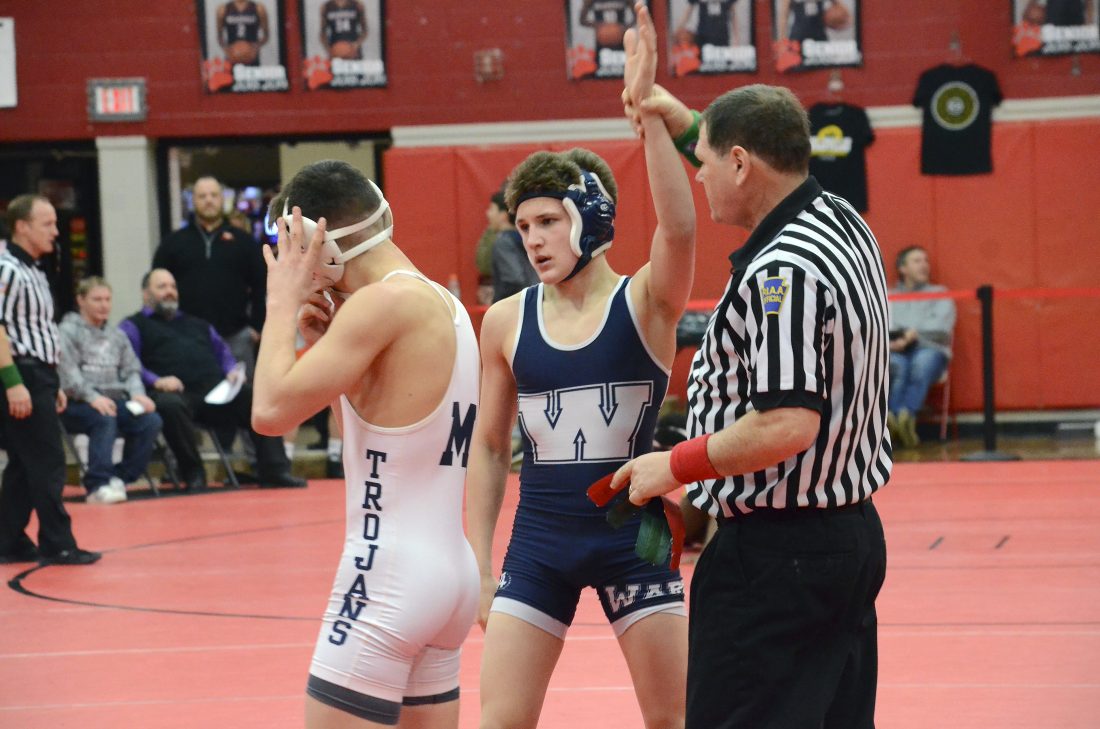 - Times Observer photo by Brian Hagberg Warren’s Ryan Madigan has his hand raised following a win in the District 10 Class 3A Tournament at Meadville High School, Thursday, Feb. 21, 2019. Madigan heads to the PIAA Class 3A Regional Tournament in Altoona today looking to advance to states following a near miss last year. The top three wrestlers in each weight class qualify for the state tournament in Hershey next weekend.