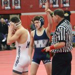 Times Observer photo by Brian Hagberg Warren’s Ryan Madigan has his hand raised following a win in the District 10 Class 3A Tournament at Meadville High School, Thursday, Feb. 21, 2019. Madigan heads to the PIAA Class 3A Regional Tournament in Altoona today looking to advance to states following a near miss last year. The top three wrestlers in each weight class qualify for the state tournament in Hershey next weekend.