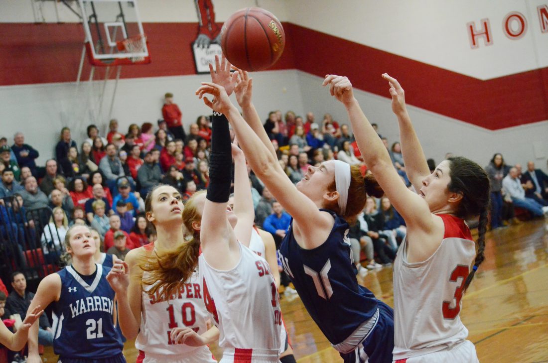 - Warren’s Emma Ruhlman gets fouled while putting up a shot in the first quarter of Saturday’s D-10 title game against Slippery Rock.