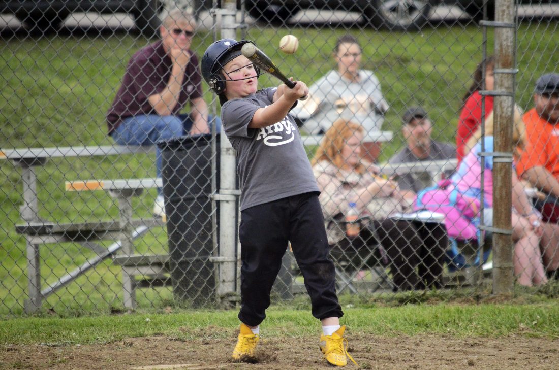 Arby’s’ Case Aul swings at a pitch during a boys minors league game against Warren Fence Company in Sheffield, Thursday, May 16, 2019. Aul smacked a single on the play as the teams opened their 2019 Warren County Youth Baseball/Softball Association season.