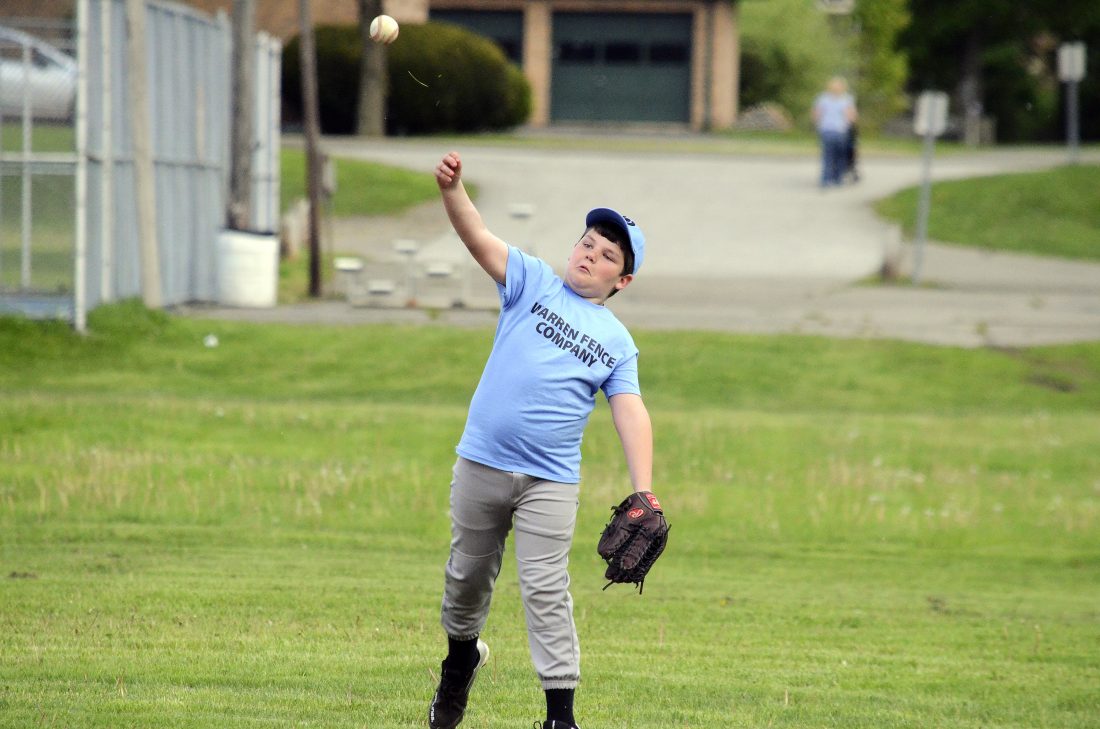 - Warren Fence Company’s Reed Wilson throws the ball in from centerfield during a game against Arby’s in Sheffield, Thursday, May 16, 2019. The teams were playing in their season opener for the 2019 Warren County Youth Baseball/Softball Association season.