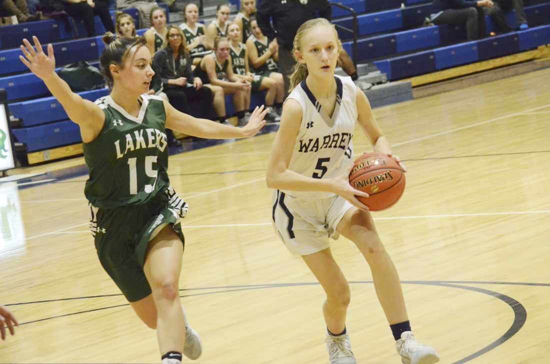 Warren’s Riley Childress locks in on defense against Mercyhurst Prep’s Lilli Rose Lang during Saturday’s Lady Dragon Tip-Off Tournament championship game.