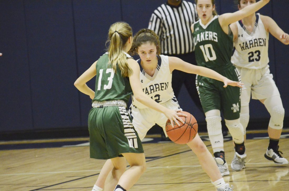Warren’s Carly Beers looks to make a pass while being defended by Mercyhurst Prep’s Alissa Bailey.
