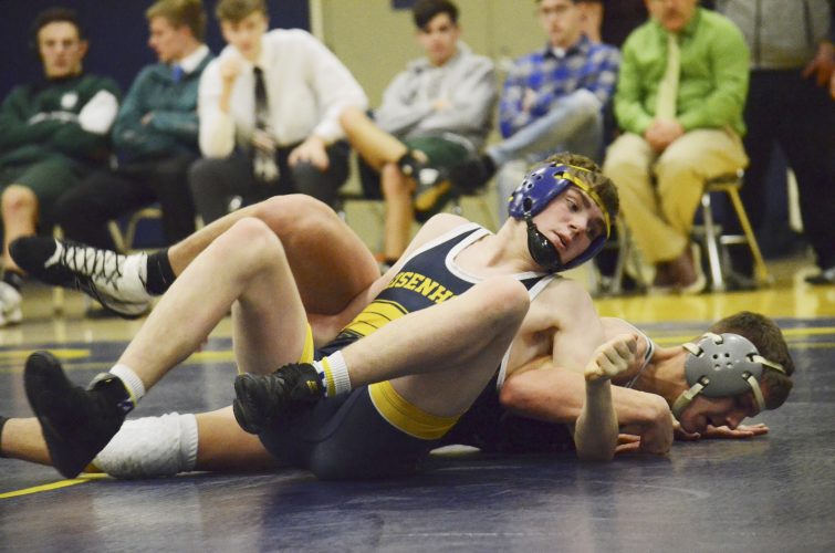 Eisenhower’s Easton Hedman gets Union City’s James Leyda in a headlock during their 132-pound bout on Wednesday at Eisenhower High School. Hedman earned a 7-3 decision and EHS came away with a 62-18 victory.