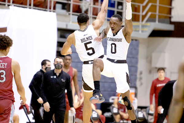 Photo courtesy of Scott Eddy | St. Bonaventure Athletics St. Bonaventure’s Kyle Lofton (0) and Jaren Holmes celebrate during Wednesday’s Atlantic 10 game against St. Joseph’s at the Reilly Center.