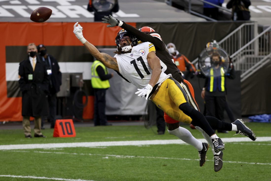 AP Photo Pittsburgh Steelers wide receiver Chase Claypool (11) attempts to catch a pass against the Cleveland Browns on Sunday in Cleveland.