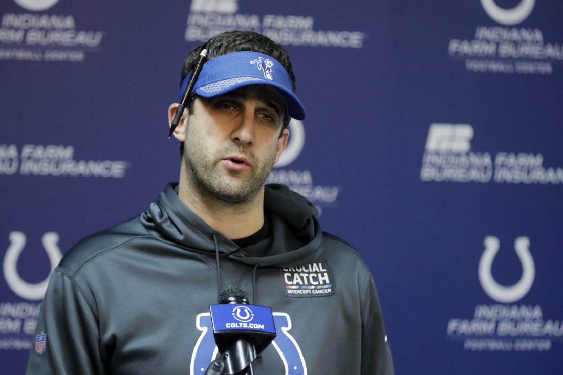 AP Photo In this Wednesday, Jan. 2, 2019 file photo, Indianapolis Colts offensive coordinator Nick Sirianni speaks during a news conference at the NFL team’s facility in Indianapolis.