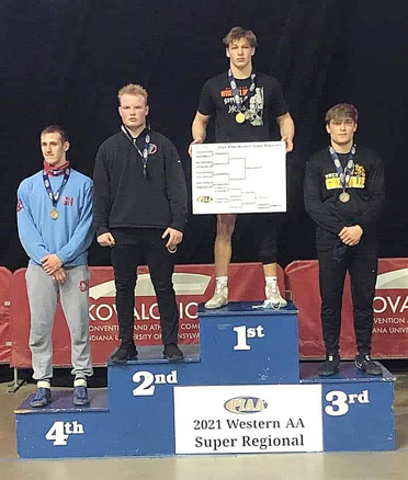 Submitted Photo Sheffield senior Ethan Finch stands on the podium after winning Saturday’s 189-pound division at the 2A West Super Regionals at IUP.