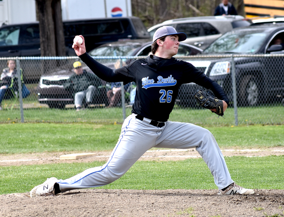 The Blue Devils starting pitcher threw a complete-game one-hitter with nine strikeouts as Cambridge Springs remained atop the region standings with an 11-0 victory over the Knights on Legion Field at Werner Park.