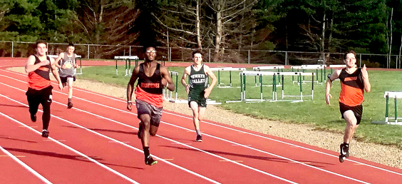Submitted Photo Sheffield’s Landon Mead, Quahien Pressley and Garret Waters battle Northern Potter and Oswayo Valley opponents to the finish line in the 200-meter dash Tuesday in Shinglehouse.