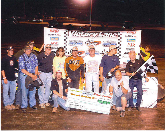 Photo courtesy of the Chautauqua Sports Hall of Fame. Standing in the back row center, Dick Barton is joined by his race team in this July 1, 2006 file photo after winning the World of Outlaws Late Model race at Stateline Speedway.