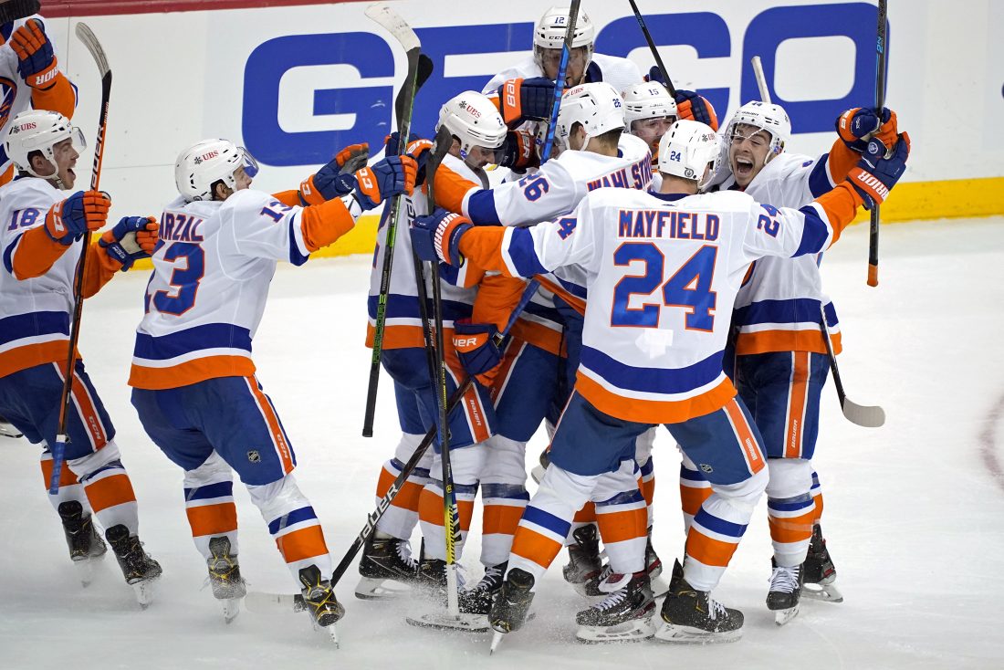 AP Photo The New York Islanders celebrate a winning overtime goal by Kyle Palmieri in Game 1 of a Stanley Cup first-round playoff series against the Pittsburgh Penguins in Pittsburgh on Sunday.