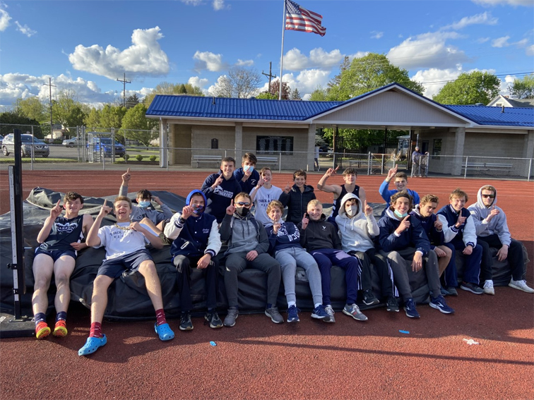 Times Observer Photo by Brian Ferry The Warren boys track and field team celebrates after winning the regional title after downing Meadville at War Memorial Field on Tuesday.
