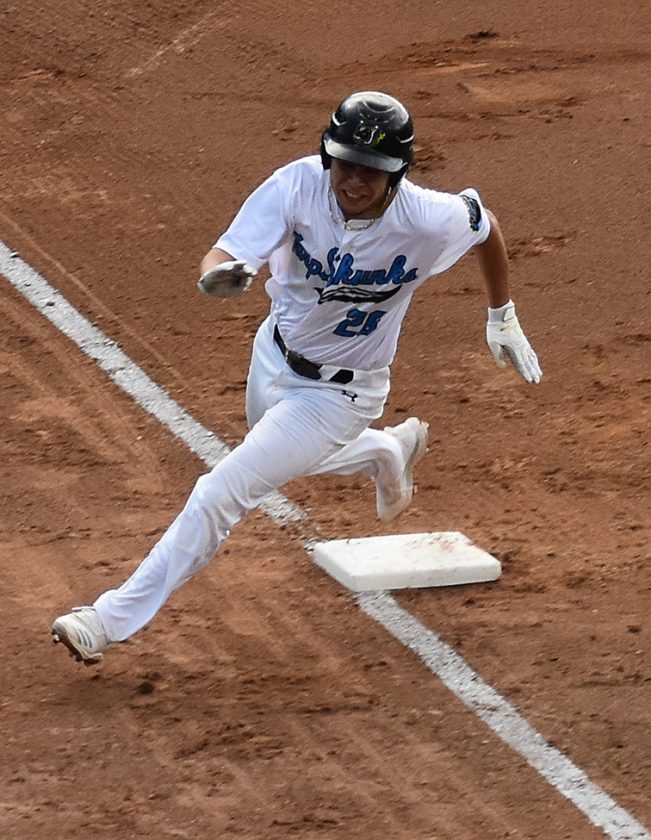 Times Observer Photo by Scott Kindberg Jamestown Tarp Skunks’ Elijah Pascual rounds third base before scoring on a single by Cory Blackburn during the third inning of Friday’s PGCBL game against the Elmira Pioneers at Diethrick Park in Jamestown, N.Y.
