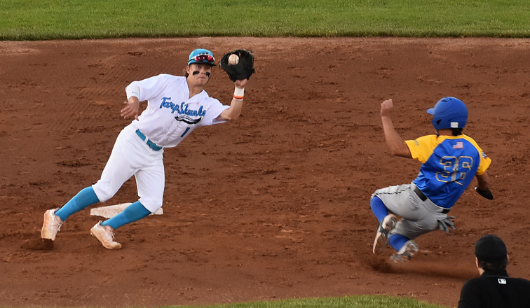 Times Observer Photo by Scott Kindberg Jamestown second baseman Mark Tucker is about to apply the tag on Niagara’s Channy Ortiz attempting to steal during the fourth inning of Monday’s PGCBL game at Diethrick Park in Jamestown, N.Y.