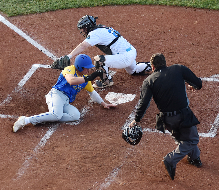 Times Observer Photo by Scott Kindberg Niagara’s JD Rodgers appears to be safe at the plate, but he was tagged out before he got there by Jamestown catcher Johnny Kampes during Tuesday’s PGCBL game at Diethrick Park.