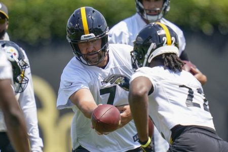- AP Photo Pittsburgh Steelers quarterback Ben Roethlisberger (7) hands off to running back Najee Harris (22) in a drill during practice Thursday in Pittsburgh.