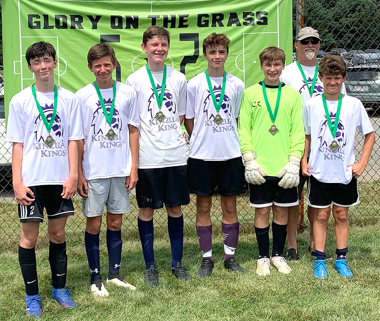 The recent Butler (Pa.) “Glory on the Grass” 5 vs. 5 Soccer Tournament champions included, from left: Finn Ordiway, Warren; Drew Donikowski, Erie Day School; Theo Kurzweg, St. Jude; Joel Morey, North East; Reece Kordes, North East; Jackson Chiocco, Fairview; and, in back, Coach Mark Ordiway.