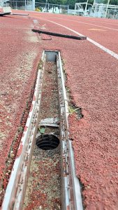 The drainage around the track has repeatedly filled up with beads from the degrading track, reducing the drainage capabilities at a facility that is already in an area prone to flooding. Volunteer efforts have been able to clean those out so far.