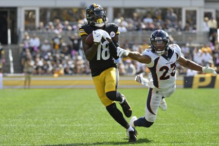- Pittsburgh Steelers wide receiver Diontae Johnson (18) hauls in a pass from quarterback Ben Roethlisberger with Denver Broncos cornerback Kyle Fuller (23) defending. Johnson took the ball in for a touchdown. AP photo