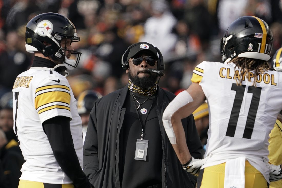 AP Photo Pittsburgh Steelers head coach Mike Tomlin, center, looks up at the videoboard as he stands with quarterback Ben Roethlisberger (7) and wide receiver Chase Claypool (11) during a timeout in the second half against the Cincinnati Bengals on Sunday in Cincinnati.
