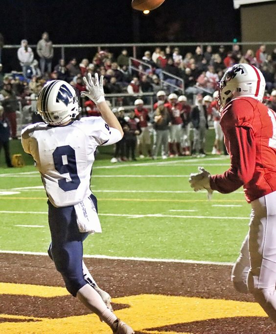 Times Observer Photo by Cody Elms Warren senior Ben White waits for a touchdown pass from Eric Dippold during Saturday’s District 10 4A playoff semifinal versus General McLane at Carter Field in Titusville.