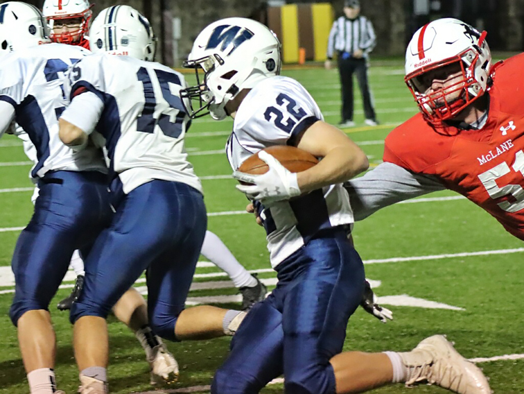 General McLane had just scored to cut Warren’s fourth-quarter lead to 18-13. On a big third-down play, Warren executed a hook-and-lateral with quarterback Eric Dippold connecting with Kody Vega for 8 yards, and Vega pitching back to a streaking Ben White with only turf between he and the end zone. Vega’s catch and a McLane defender on his back didn’t give White much room to squeeze by and he stepped out of bounds by a tip-toe. Warren was forced to punt.