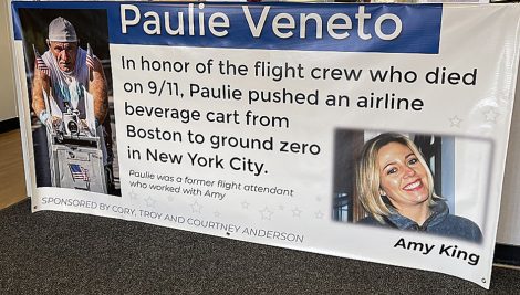 So, runners, walkers and any spectators along the Amy King 5K route will see that the cart Veneto is pushing bears photos of the crew members from United Airlines flights 175 and 93 on its top; and all four of the hijacked planes’ flight numbers on the sides, along with images of the towers and a set of wings.