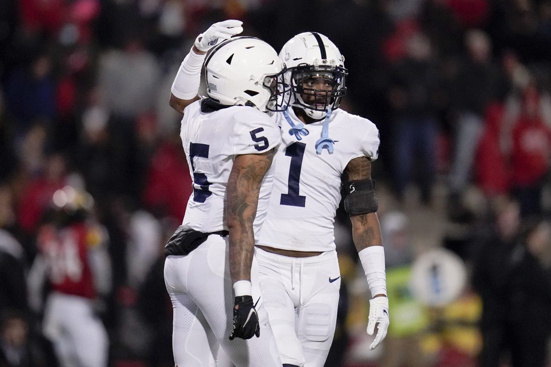 AP Photo Penn State cornerback Tariq Castro-Fields (5) and safety Jaquan Brisker (1) react after teammate safety Ji’Ayir Brown, not visible, returned an interception for a touchdown against Maryland during the second half Nov. 6 in College Park, Md.