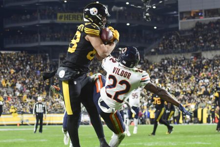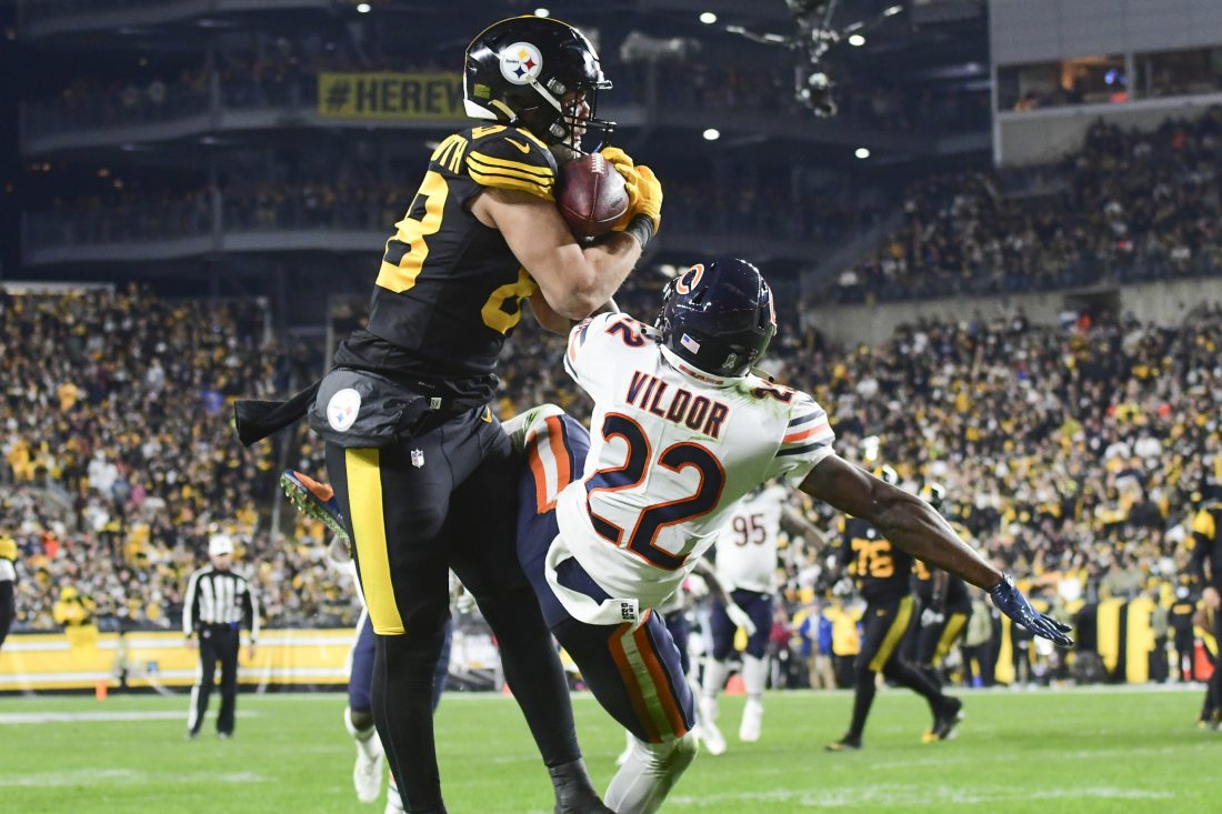 - Pittsburgh Steelers tight end Pat Freiermuth (88) makes a catch for a touchdown as Chicago Bears cornerback Kindle Vildor (22) defends during the second half of Monday’s game. AP Photo