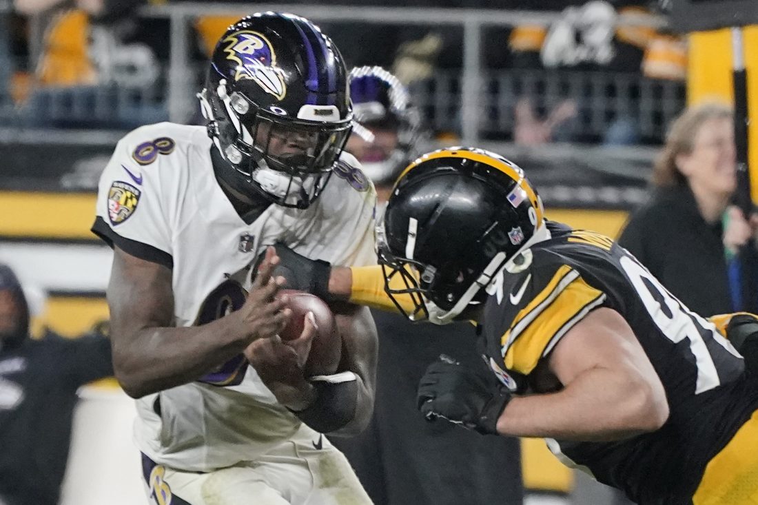 AP Photo Baltimore Ravens quarterback Lamar Jackson (8) scrambles as Pittsburgh Steelers outside linebacker T.J. Watt (90) swats at the ball during the second half of a Sunday’s NFL game in Pittsburgh.
