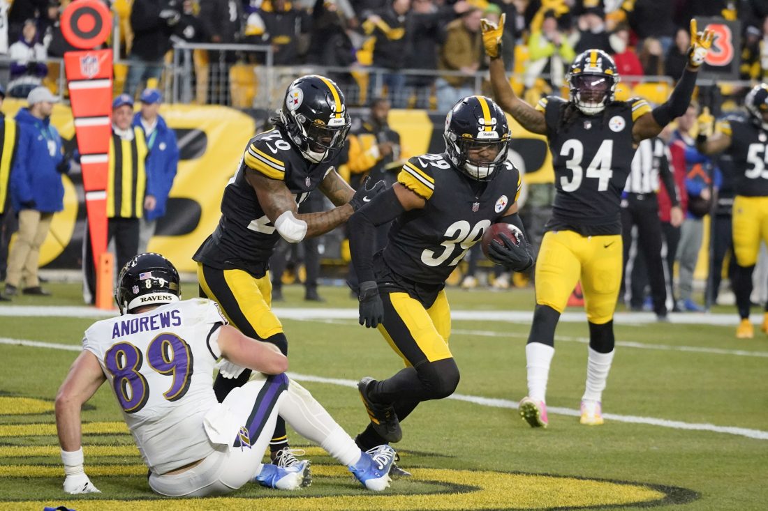 AP Photo Pittsburgh Steelers free safety Minkah Fitzpatrick (39) celebrates after he intercepted a pass to Baltimore Ravens tight end Mark Andrews (89) during the first half Sunday in Pittsburgh.