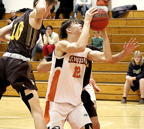 Times Observer Photo by Cody Elms Sheffield's Connor Finch drives to the hoop during the Wolverines’ 60-48 win. Finch led Sheffield with 25 points.
