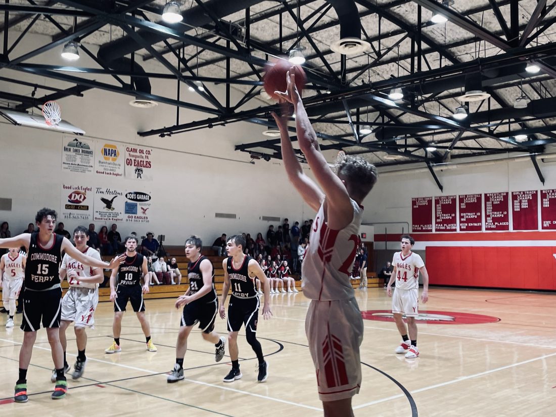 Submitted Photo Youngsville’s Koby Hendrickson shoots a 3-pointer during Thursday’s game against Commodore Perry.