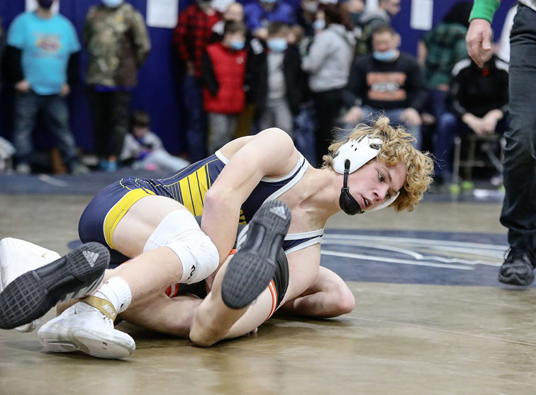 Several Eisenhower wrestlers had strong starts at the two-day Patrick J. Morales Memorial Tournament at Falconer (N.Y.) High School on Friday. Reaching the semifinals were Cole Kellogg (126), seen above; Gannon Jaquay (152); Cael Black (215); and Justin Darr (215). Darr earned an injury forfeit over top-seeded Hayden Linkderhoff of Corry to advance. The tournament continues today.