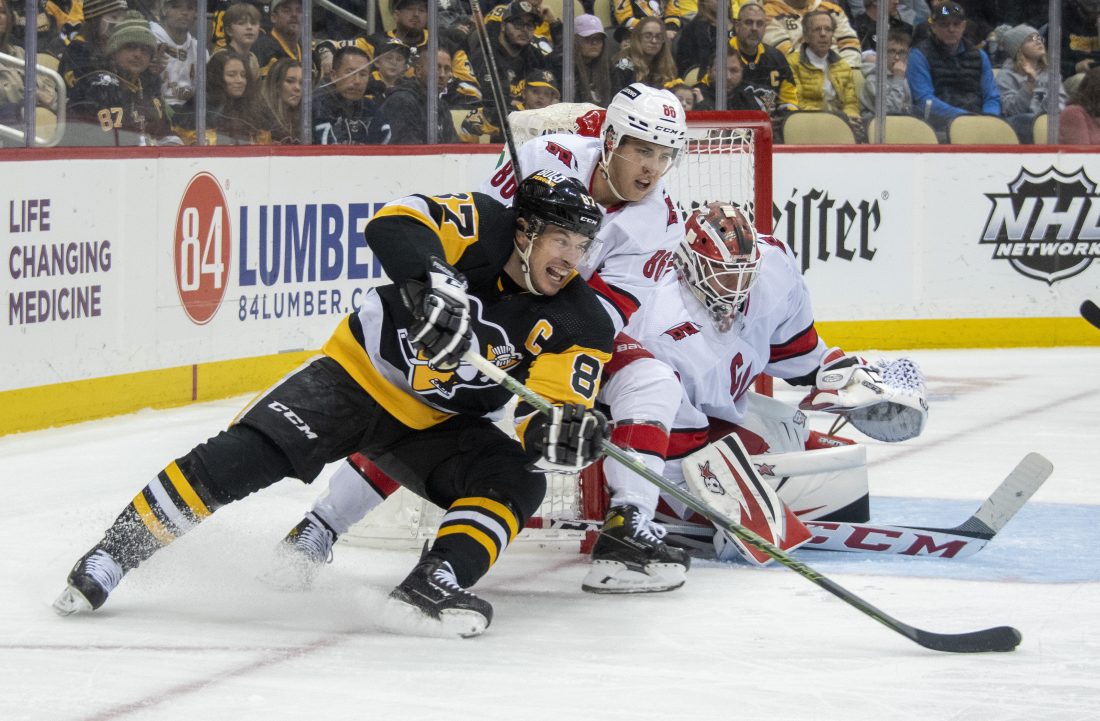 AP Photo Pittsburgh Penguins center Sidney Crosby, 87, tries to skate past Carolina Hurricanes winger Teuvo Teravainen, 86, as goalie Antti Raanta, 32, looks on during the second period of an Sunday’s game against the Carolina Hurricanes in Pittsburgh.