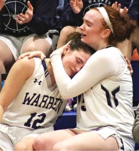 - Warren seniors Emma Ruhlman, right, and Riley Childress embrace after leaving a 58-36 PIAA 5A first-round playoff loss to Oakland Catholic on Wednesday at Warren Area High School. Times Observer Photo by Cody Elms